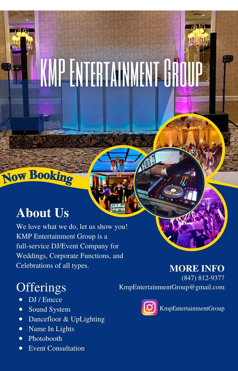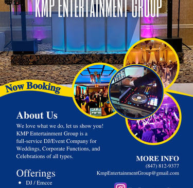 Weddings ⢠Corporate Events ⢠Celebrations | Serving Chicago & Suburbs When it comes to creating unforgettable moments, KMP Entertainment Group Inc. brings the sound, style, and experience you need to make your event extraordinary. Based in the heart of Chicago, we proudly serve the city and surrounding suburbs as a full-service DJ and event production company for weddings, corporate functions, milestone celebrations, and more.